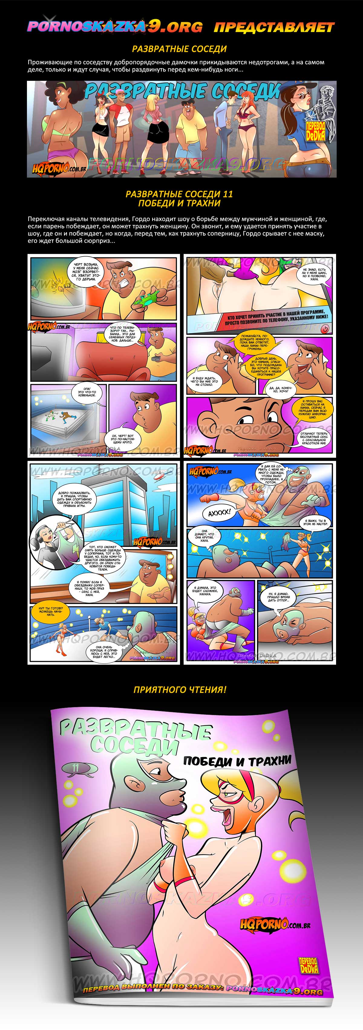 Порно комикс «Развратные соседи. Часть 11. Победи и трахни.» Переключая каналы телевидения, Гордо находит шоу о борьбе между мужчиной и женщиной, где, если парень побеждает, он может трахнуть женщину. Он звонит, и ему удается принять участие в шоу, где он и побеждает, но когда, перед тем, как трахнуть соперницу, Гордо срывает с нее маску, его ждет большой сюрприз…